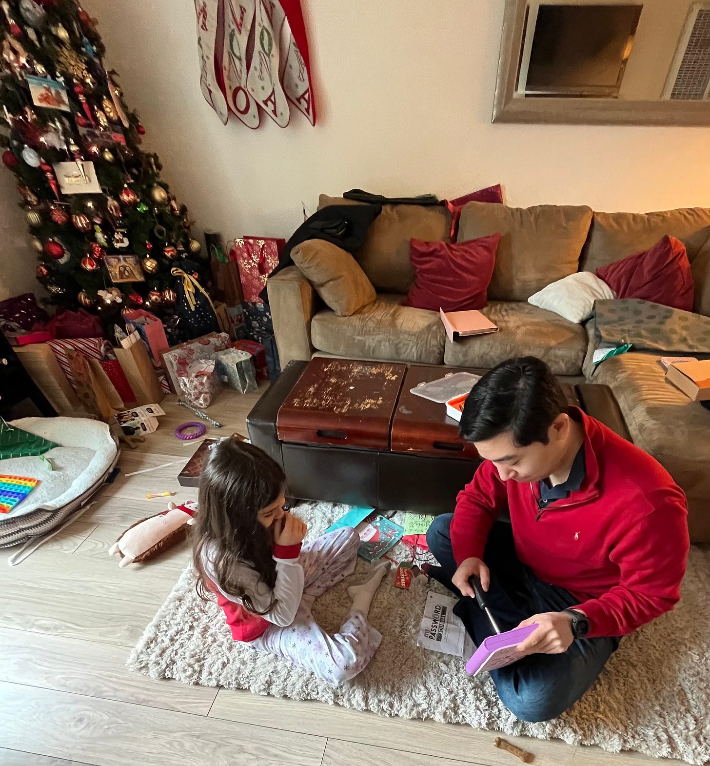 A couple of Christmases ago in California. Putting toys together and installing batteries into noisemaking devices designed to annoy parents for the daughter of my mom's friend.
