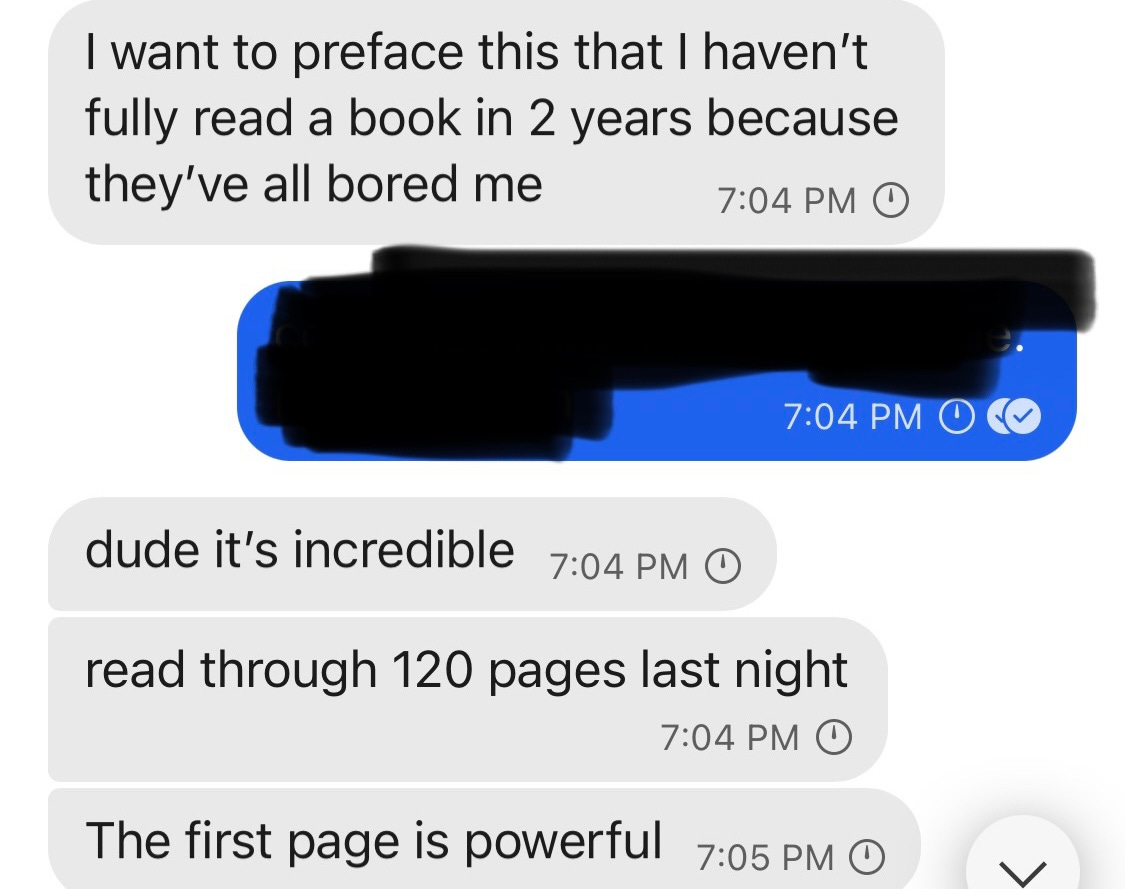 Like many people, I’ve heard that Gen Z doesn’t read books. One reason (not the only reason) is that most books are uninteresting or kind of boring (which, as Nassim Nicholas Taleb says, is the only very bad thing for a book to be). My book is good. Here’s a message I received from a 20-year-old Zoomer friend who read an early draft of the book: