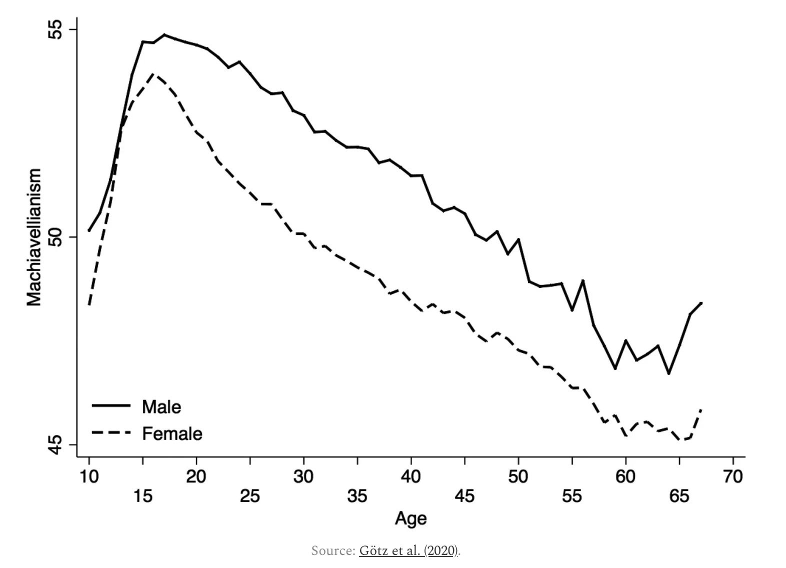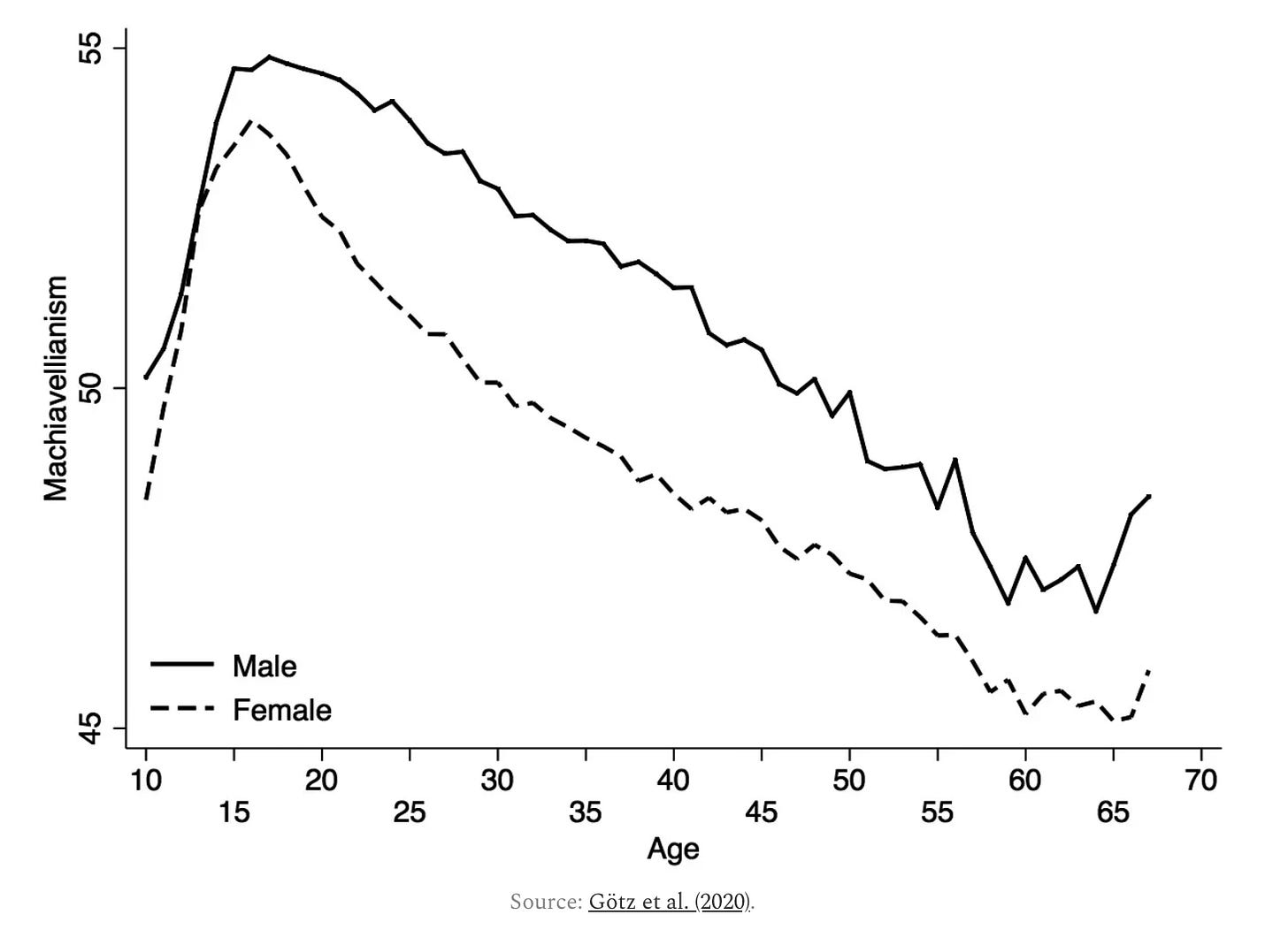 3. Age differences in the Dark Triad (psychopathy, narcissism, and Machiavellianism) often dwarf sex differences. So, for example, while men are somewhat more Machiavellian than women at every age, young women are far more Machiavellian than middle-aged men. (source; h/t Steve Stewart-Williams).