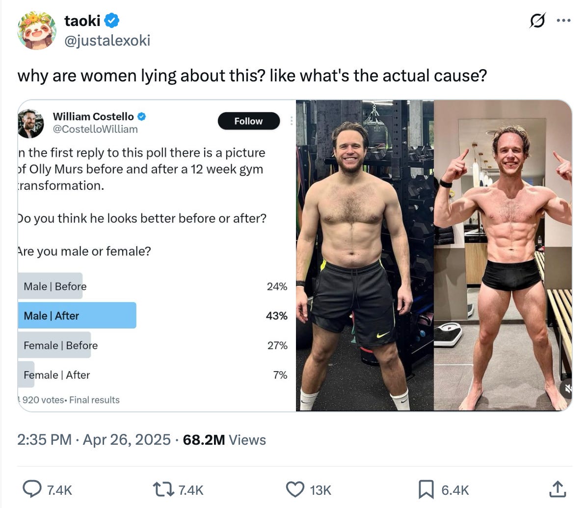In a poll, women overall preferred the “before” version, where Murs has more of a muscular dad bod. In contrast, men overall said they preferred the “after” version, where Murs has retained his muscularity and leaned out to single-digit body fat.