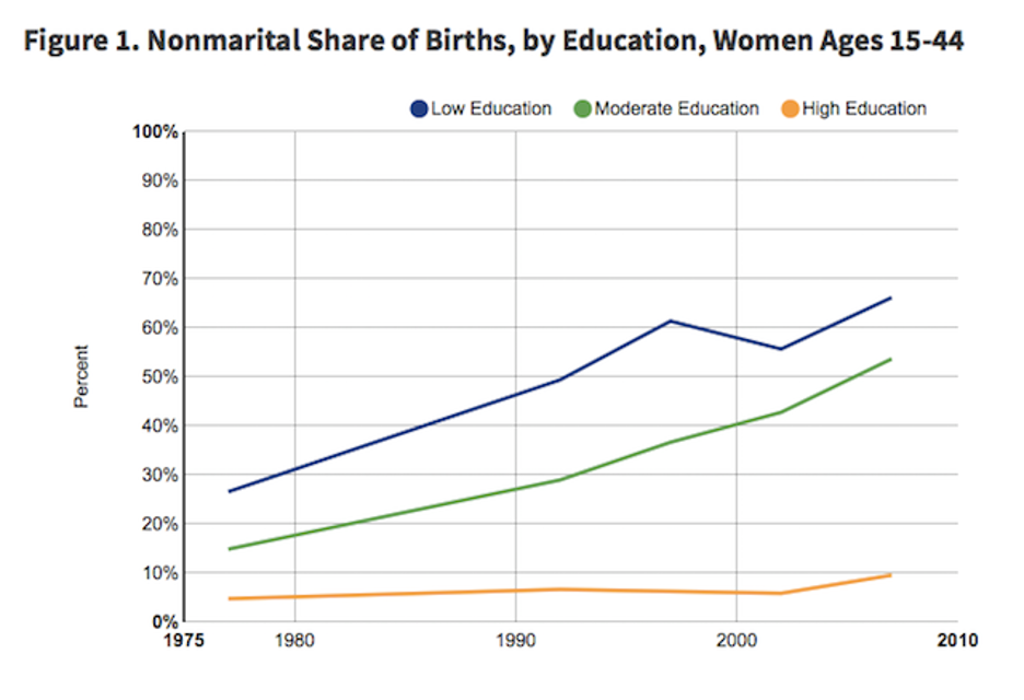 Elites tend to marry one another. They stay married. And raise their children within these marriages in order to secure dynastic continuity. Educated parents, particularly mothers, are better equipped to prepare their children for success. Divorce, which is both financially burdensome and a distraction from demanding careers and child-rearing, is less common among the wealthy. Additionally, children born outside of marriage introduce further complications and are therefore exceedingly rare in these circles. And, of course, the attributes that predict professional success are the same attributes that predict long-term romantic stability and marital commitment (intelligence, conscientiousness, impulse control, and so on). For people who lack such attributes, strong social norms and regular reminders from their society’s elites help them to combat their natural inclination to live for the moment and to instead behave in more prosocial ways.